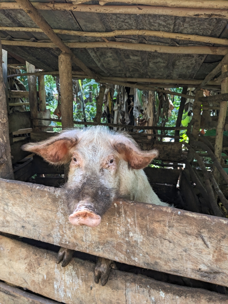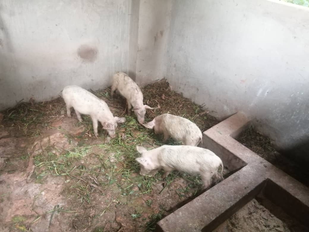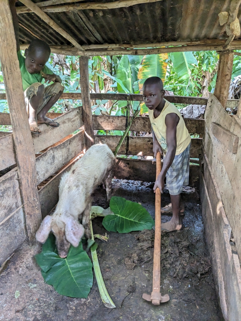 There are some pigs being looked after and fed by the children from the center. In 2023, a new piggery house was built and since then, the number of pigs is growing. The goal is that it becomes an income generating project to the center as well as a way to improve the variety of the meals.